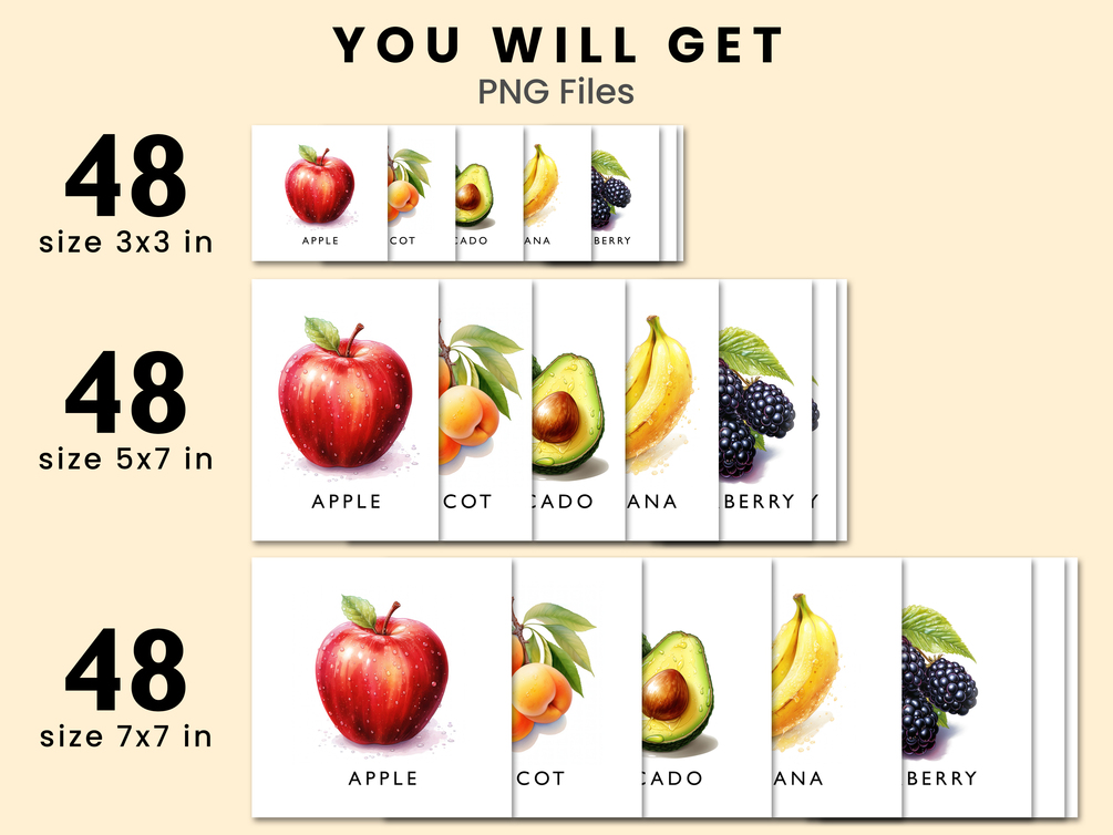 48 PNG files, sized 3x3 inches | 48 PNG files, sized 5x7 inches | 48 PNG files, sized 7x7 inches | 1 PDF file, 8 pages, A4 size with ready-to-print 3x3 inch flash cards | 1 PDF file, 24 pages, A4 size with ready-to-print 5x7 inch flash cards