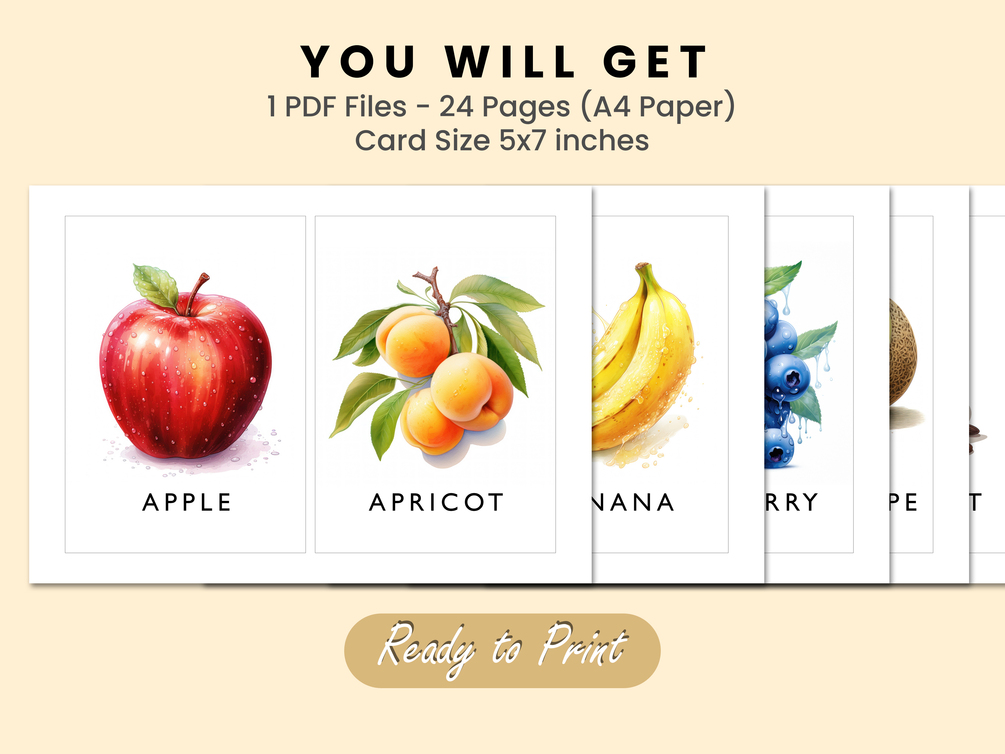 These high-quality digital files can be easily downloaded and printed at home or at a local printing service. They are perfect for homeschooling, early childhood education, and as nursery decor. The watercolor vector illustrations bring the fruits to life, making learning a joyful experience for your little ones.